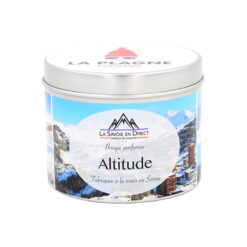Bougie parfumée “Altitude” dans sa boite en aluminium avec ses photos de La Plagne et son couvercle logo La Plagne. Bougie parfumée avec une note florale et poudrée. La cire de nos bougies est 100% naturelle composée de cire végétale et de cire d’abeille. La mèche en coton diffuse toute la finesse du parfum. Nos bougies sont fabriquées en France dans le département de la Savoie.