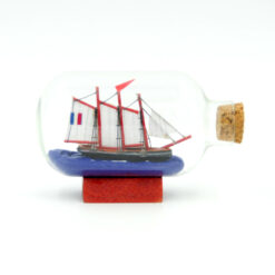 Petite bouteille en verre avec un voilier à l’intérieur.
