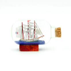 Petite bouteille en verre avec un voilier à l’intérieur.