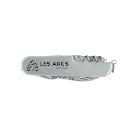 Couteau multifonctions (7 outils) en acier inoxydable avec sur l’une des deux faces le logo Les Arcs.