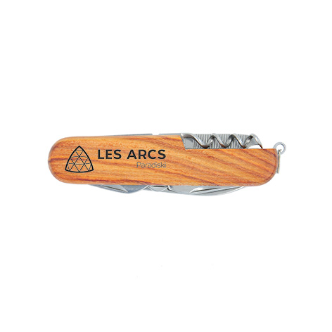 Couteau multifonctions (7 outils) en bois avec sur l’une des deux faces le logo Les Arcs.