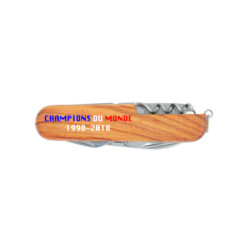 Couteau multifonctions (7 outils) en bois avec sur l’une des deux faces l’inscription « Champions du Monde 1998-2018 » pour célébrer la victoire de l’équipe de France de Football.