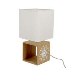 Lampe cubique en bois avec dessin blanc de flocons et fleurs. L’abat-jour est en tissu blanc afin de diffuser doucement la lumière. Une décoration neutre et sobre sera mise en valeur par cette lampe tendance dans un esprit géométrique.