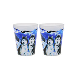 Lot de 2 verres à liqueur avec plusieurs chiens de la race huskys sur un fond de paysage d’hiver.
