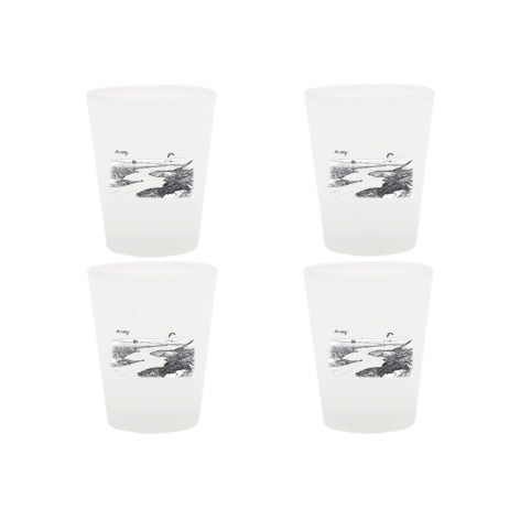 Lot de 4 verres shooter dessin traits du Lac d’Annecy. Impression du dessin sur les deux faces. Finition du verre : dépoli.