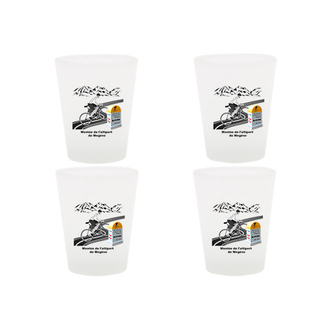 Lot de 4 verres shooter avec dessin vélo et borne montée de l’Altiport de Megève. Impression du dessin sur les deux faces. Finition du verre : dépoli.