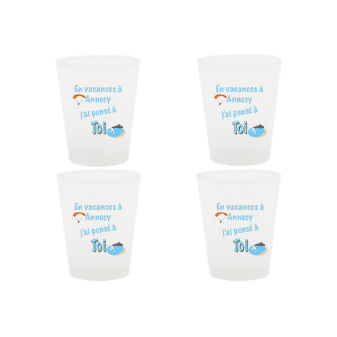 Lot de 4 verres shooter dessin « En vacances à Annecy j’ai pensé à Toi ». Impression du dessin sur les deux faces. Finition du verre : dépoli.