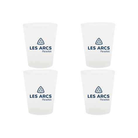 Lot de 4 verres shooter avec le logo des Arcs. Impression du logo sur les deux faces. Finition du verre : dépoli.