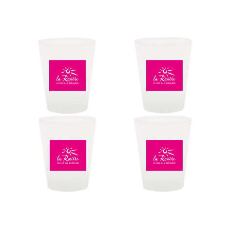 Lot de 4 verres shooter avec le logo de La Rosière. Impression du logo sur les deux faces. Finition du verre : dépoli.