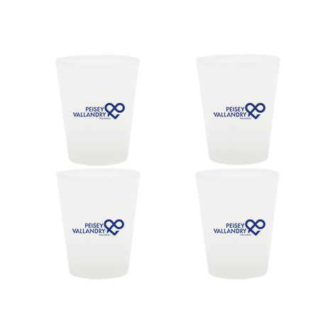 Lot de 4 verres shooter avec le logo de Peisey-Vallandry. Impression du logo sur les deux faces. Finition du verre : dépoli.