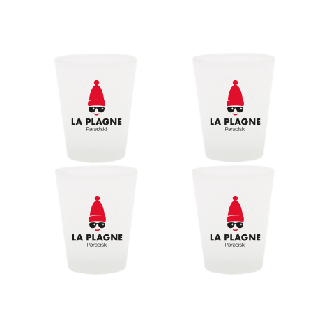Lot de 4 verres shooter avec le logo de La Plagne. Impression du logo sur les deux faces. Finition du verre : dépoli.