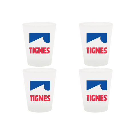 Lot de 4 verres shooter avec le logo de Tignes. Impression du logo sur les deux faces. Finition du verre : dépoli.