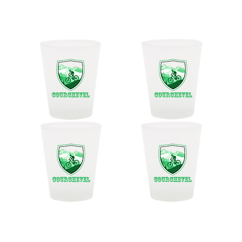 Lot de 4 verres shooter dessin blason VTT Courchevel. Impression du dessin sur les deux faces. Finition du verre : dépoli.