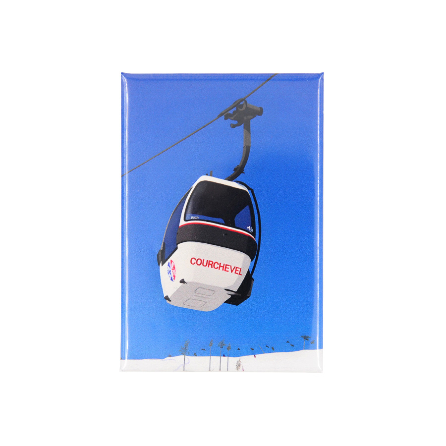 Magnet souvenir dessin de l’ancienne télécabine des Chenus à Courchevel 1850 en hiver.