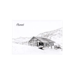 Magnet souvenir dessin traits d’une grange / restaurant à Flumet en hiver.