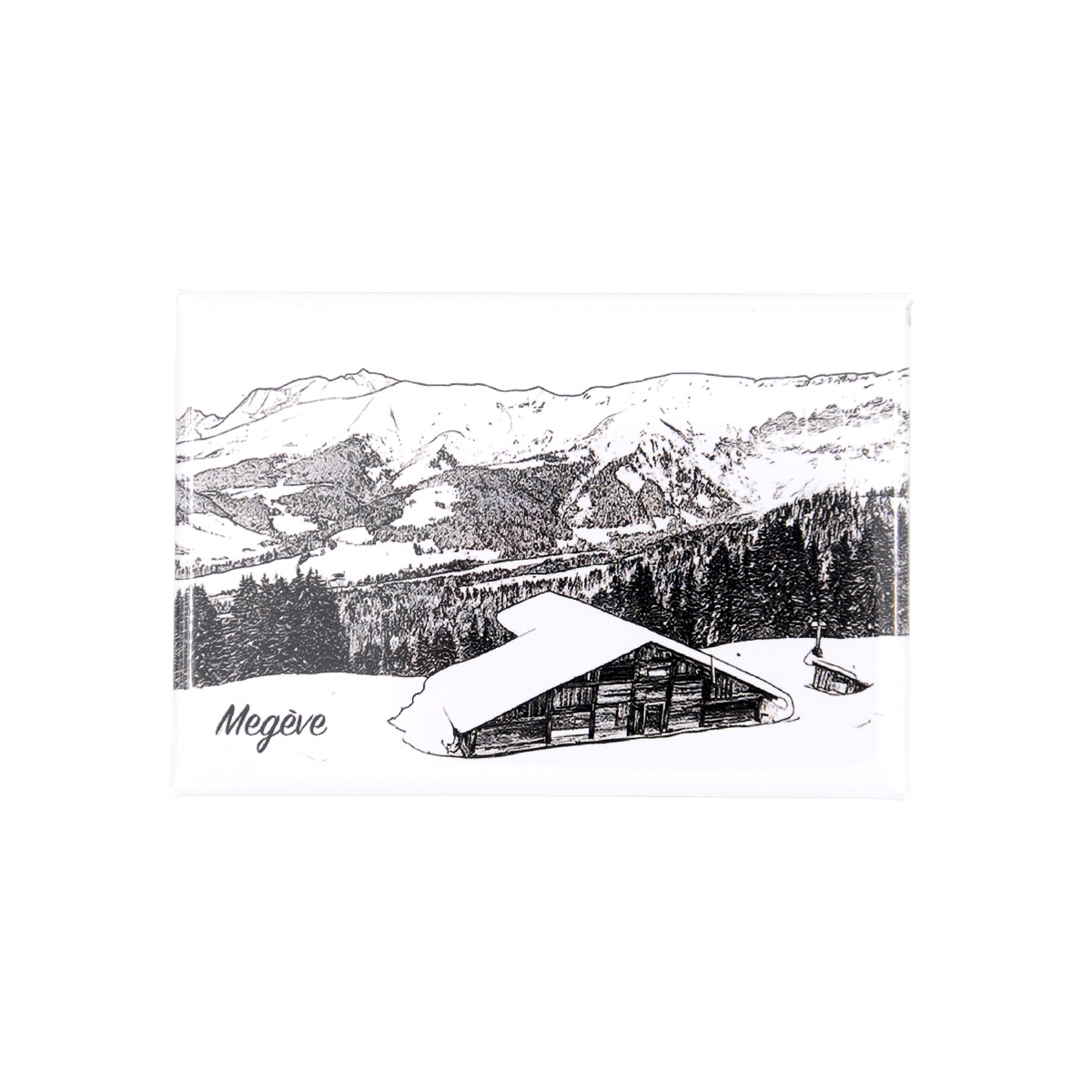 Magnet souvenir dessin traits d’une grange à Megève en hiver.