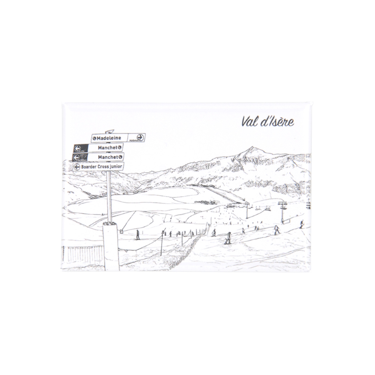 Magnet souvenir dessin traits des pistes de Val d’Isère en hiver.