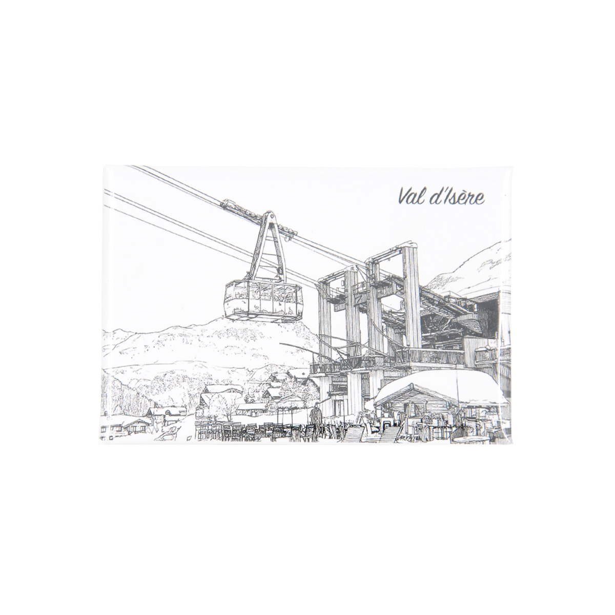 Magnet souvenir dessin traits du téléphérique du Fornet à Val d’Isère en hiver.