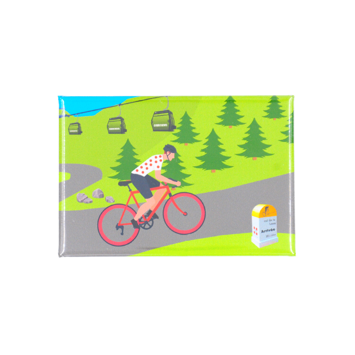 Magnet souvenir dessin vélo et cabines avec borne de la montée du col de La Loze par Courchevel.