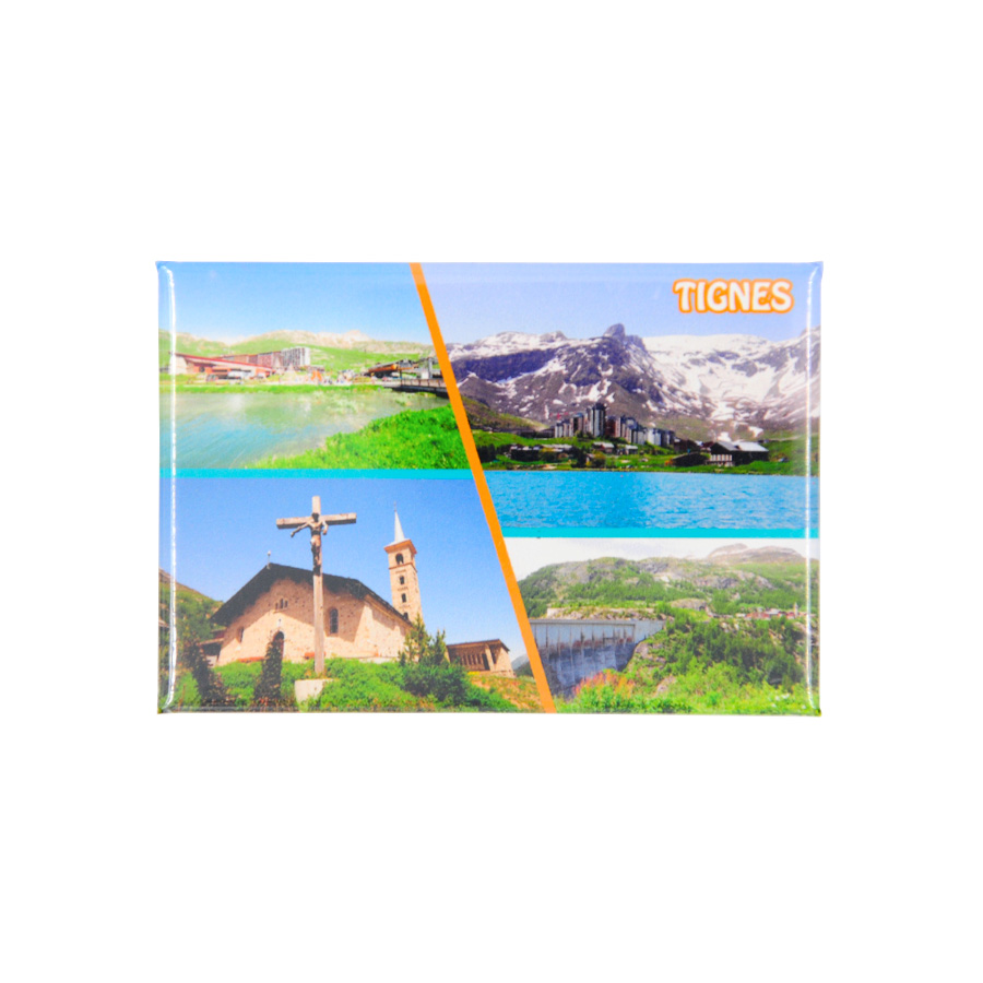 Magnet souvenir pêle-mêle photos de Tignes en été.