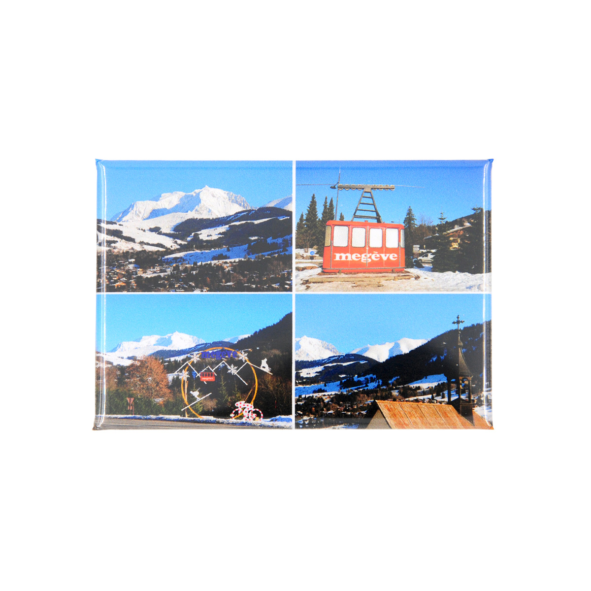 Magnet souvenir pêle-mêle photos de Megève en hiver.