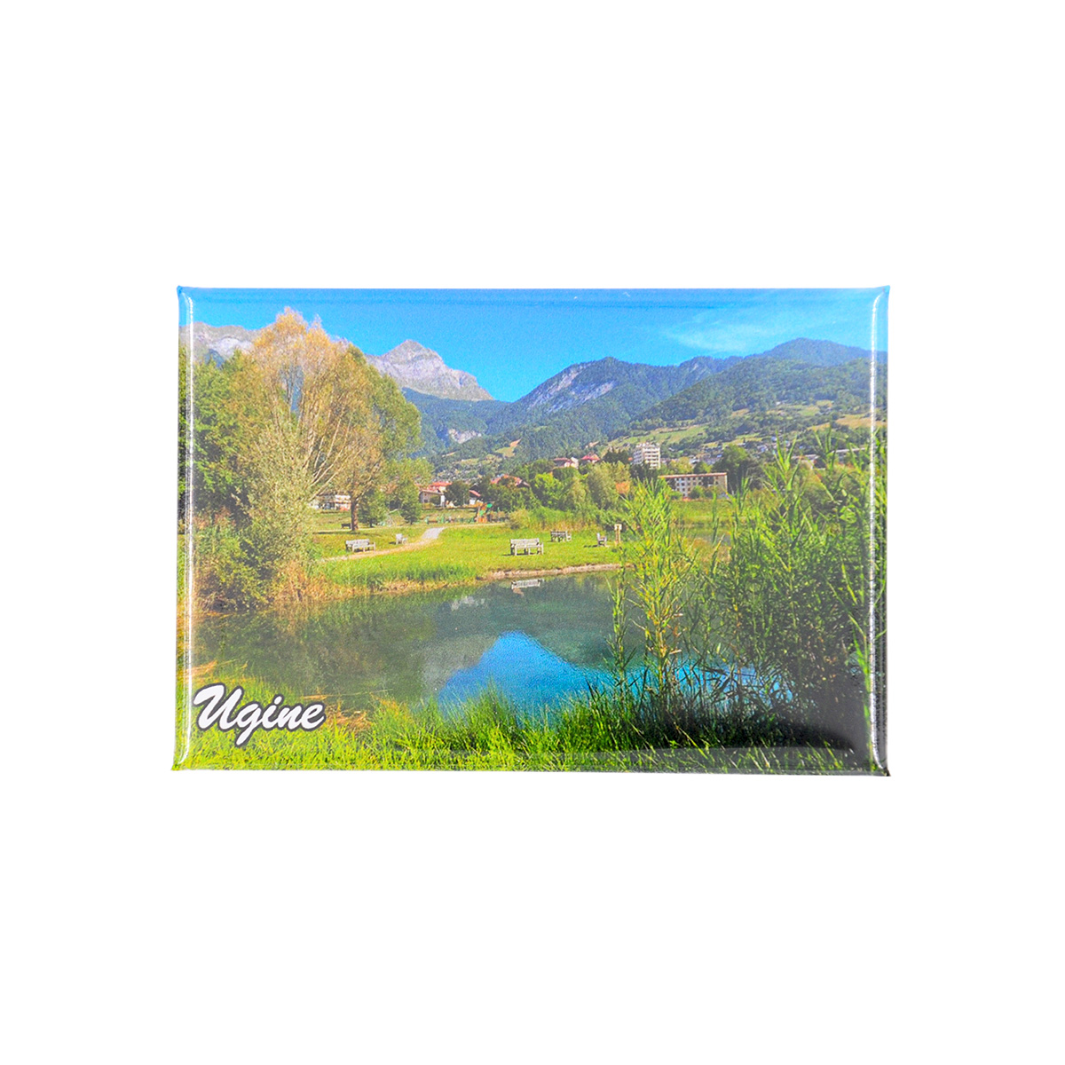 Magnet souvenir photo du plan d’eau d’Ugine en été.