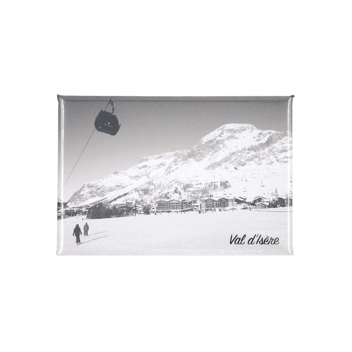 Magnet souvenir photo en noir et blanc du front de neige de Val d’Isère en hiver.