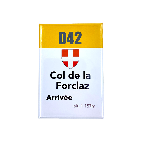 Magnet souvenir type borne Col de La Forclaz avec l’altitude d’arrivée.