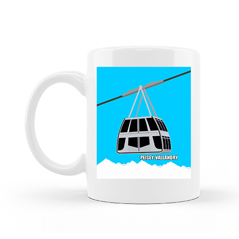 Mug dessin du téléphérique Vanoise Express en version hiver sur les deux faces avec l’inscription Peisey-Vallandry.