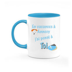 Mug souvenir dessin « En Vacances à Annecy j’ai pensé à Toi ». Anse et intérieur bleu du mug.