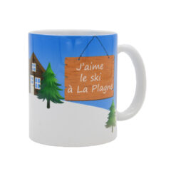 Mug d’une marmotte skieuse avec l’inscription « J’aime le ski à … « . Que vous pouvez compléter en choisissant le nom de de votre station de ski préféré. A défaut, il sera juste inscrit « J’aime le ski ».