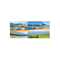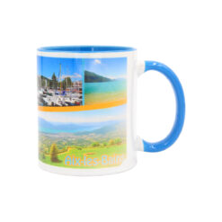 Mug souvenir pêle-mêle photos d’Aix-les-Bains. Anse et intérieur bleu de la tasse.