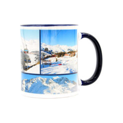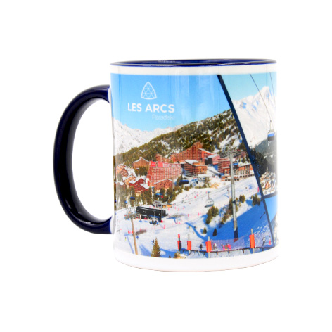 Mug souvenir photos Les Arcs en hiver. Anse et intérieur bleu du mug.