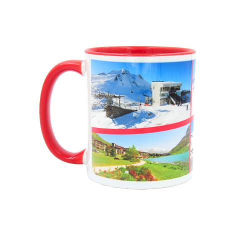 Mug souvenir photos de Tignes en été / hiver. Anse et intérieur rouge du mug.