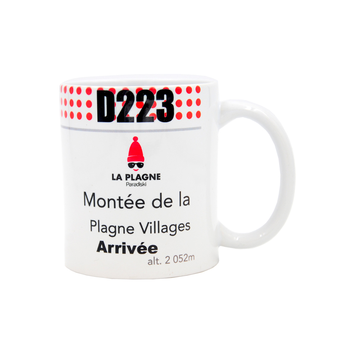 Mug dessin inspiré d’une borne vélo, montée de La Plagne Villages. Visuel imprimé sur les deux faces.