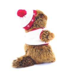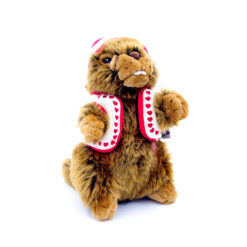 Peluche marmotte avec son bonnet à pompon rouge et son gilet. La peluche marmotte siffle quand on appuie sur son ventre !