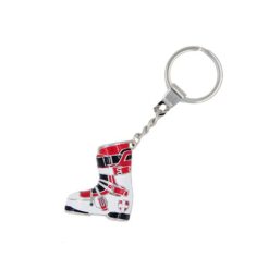 Porte-clés en forme de chaussure de ski rouge et blanc avec l’inscription « Savoie » d’un côté et de l’autre l’écusson de la Savoie.