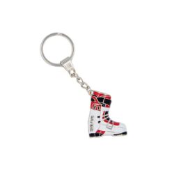 Porte-clés en forme de chaussure de ski rouge et blanc avec l’inscription « Savoie » d’un côté et de l’autre l’écusson de la Savoie.