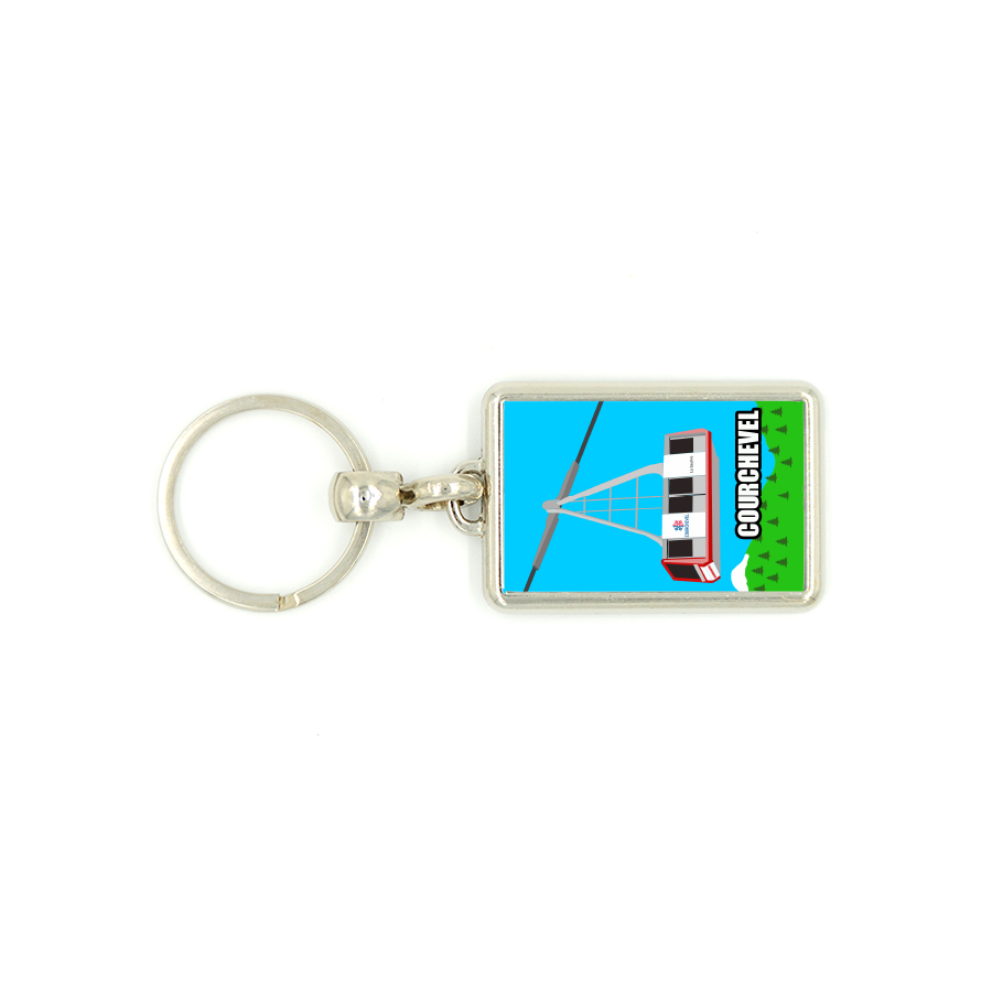 Porte-clés en métal dessin de l’ancien téléphérique de Courchevel en été.
