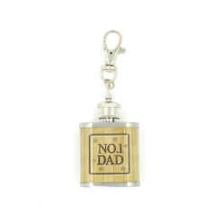 Porte-clés flasque « NO.1 Dad », véritable flasque pouvant contenir de l’alcool à l’intérieur. Longueur du porte-clés : 11,6 cm.