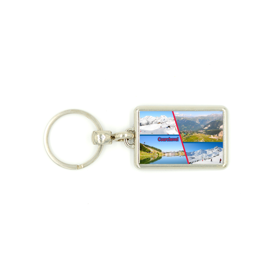 Porte-clés en métal avec des photos en pêle-mêle de Courchevel en été/hiver.