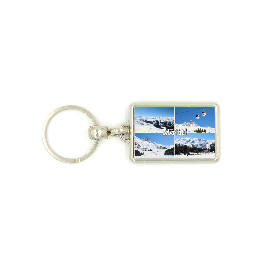 Porte-clés en métal avec des photos en pêle-mêle de Méribel en hiver.
