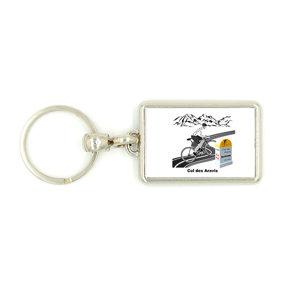 Porte-clés en métal dessin vélo et borne Col des Aravis.