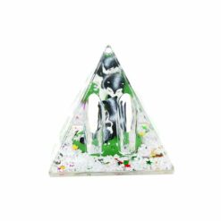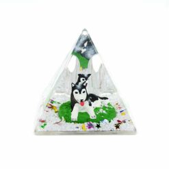 Pyramide à neige avec deux huskies. A l’arrière de la boule à neige se trouve deux emplacements pour deux stylos.