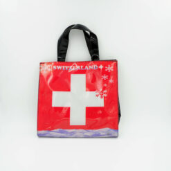 Sac à main en vinyle avec l’inscription « Switzerland » sur fond de drapeau de la Suisse.