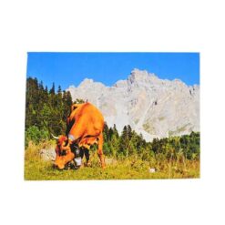 Tableau représentant une vache avec sa cloche juste devant l’Aiguille du Fruit dans la station de ski de Méribel dans le département de la Savoie, France. Il s’agit d’une photo imprimée sur une toile et mise sur un cadre en bois à la façon d’une toile de peintre. Déjà monté, il ne vous restera plus qu’à l’accrocher au mur. Toile imprimée et montée en France.