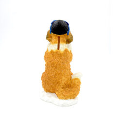 Figurine en résine avec la fente pour introduire la pièce dans le dos du chien. Pas besoin de casser la tirelire pour récupérer les sous à l’intérieur, un bouchon se trouve sous la figurine.